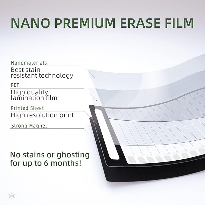 - Erases easily - Our calendars use premium nano erase film, making it incredibly easy to wipe off notes, even those that have been written for a long time. No residue, no fuss.
