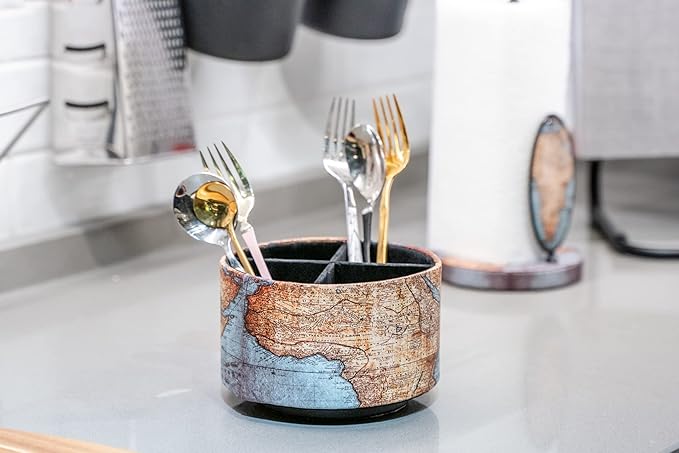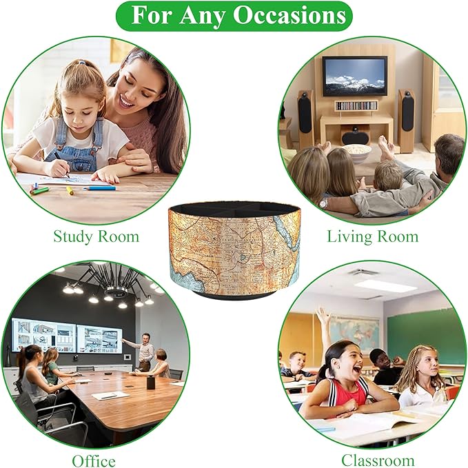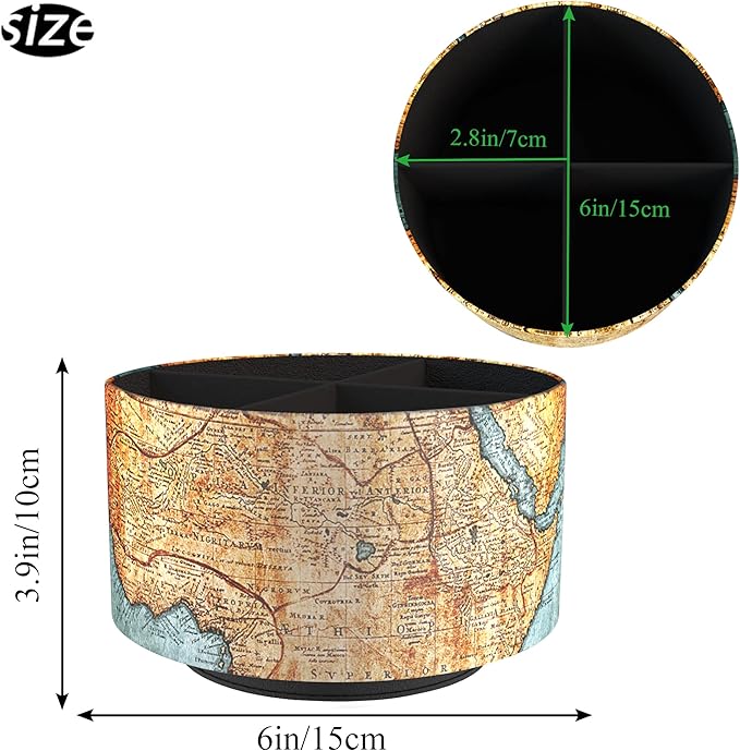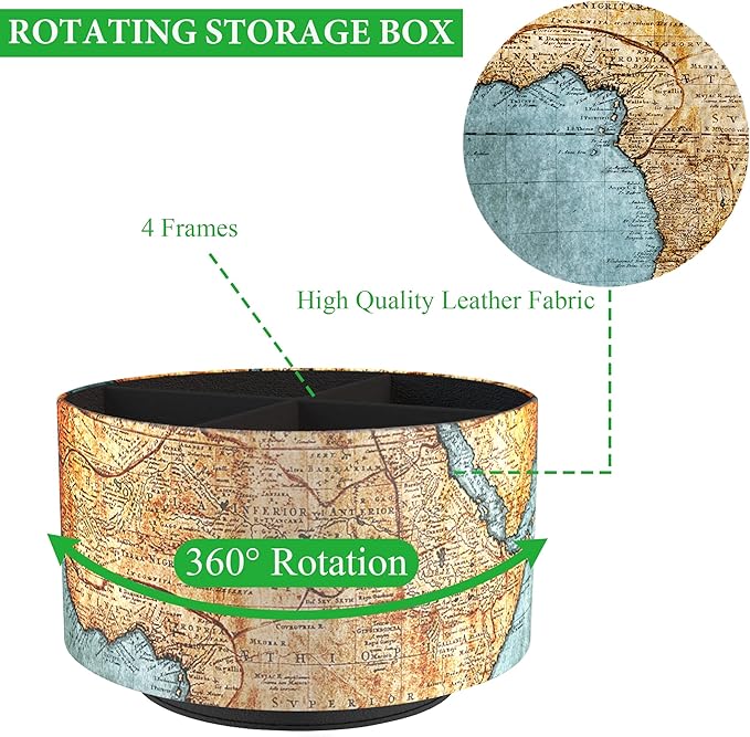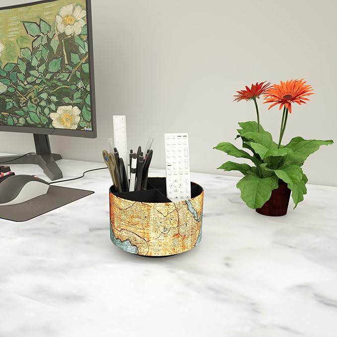Hennaja Round Leather Art Supply Organizer,Remote Control Holder,360 Degree Rotating,Multi-Functional Pencil Holder,4 Compartments Desktop Stationary Organizer(1-Vintage Map)