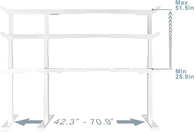 - Powerful and smooth dual motor lift system with a robust steel frame ensuring stability. The frame dimensions range from 42.3 inch to 70.9 inch[1070-1800 mm] in length and 25.9 inch to 51.5 inch [660-1300 mm] in height