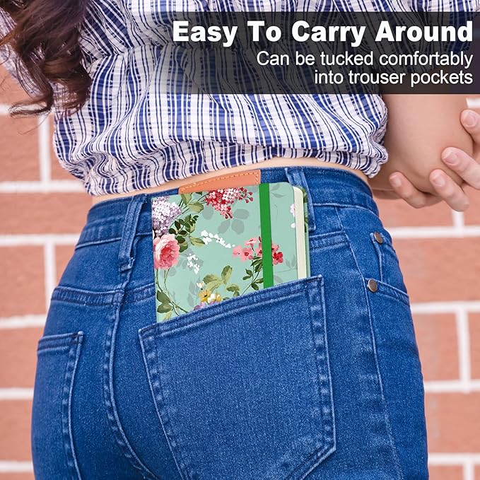 - Pocket Hardcover Notebook: The cute A6 mini notebooks measures 3.9x5.7inch. Fits in back pocket, shirt pocket or purse well. Includes 160 pages ivory thick paper, 1 ribbon bookmark, 1 inner pocket, 1 Pen Holder loop and 1 elastic closure band