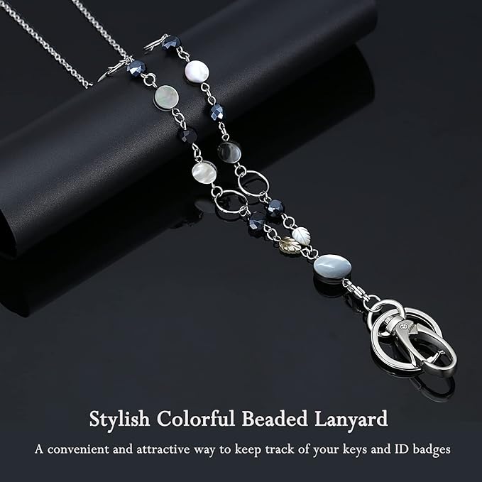 - LANYARDS FOR KEYS: The fashion beaded lanyard is functional yet sophisticate and elegant looking. It looks like a stylish necklace, but works like a key lanyard. This lanyard with ID holder provides a practical way to display your work badges, keys and identification card. You can wear it anywhere, in offices, schools or at home, or going to parties. Perfect lanyard keychain for nurses, teachers, students, office workers and more. A truly beautiful silver chain lanyards for women.