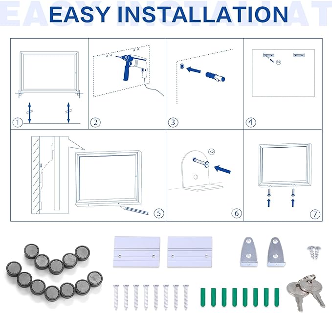 - 💧OUTDOOR USE —Weather resistant cabinet construction features aluminum frame with a satin finish, full-length piano hinges add strength and durability to the door frame. Drainage holes in the bottom and sealed backing means you can mount the board outdoors.