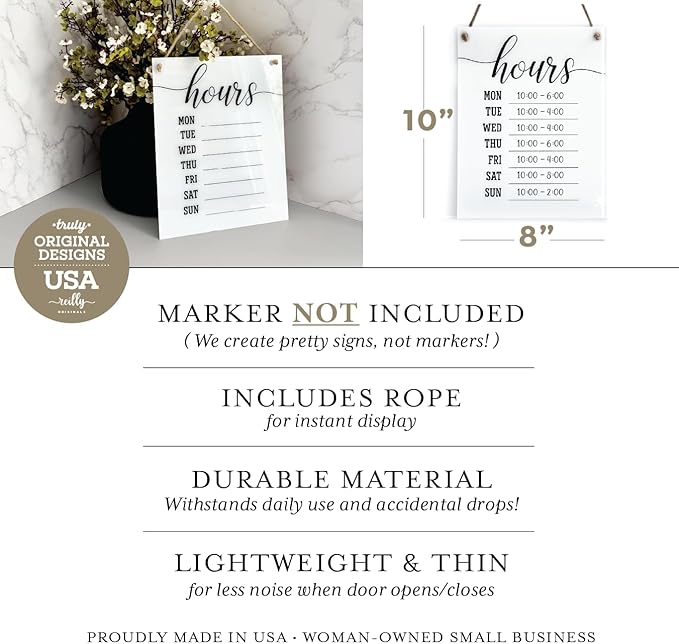 Reilly Originals Dry Erase Elegant Store Hours Sign with Rope ~ Marker NOT Included ~ 8x10 Inches