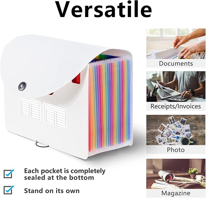 - Stable & sturdy construction: Expanding file folder is made from durable wipe-clean polypropylene. Acid-free and high-quality for using trustingly. Waterproof & sturdy enough to keep the file organizer from collapsing. The accordion folder's cord closure and adjustable flap provide additional security. Built-in file separation layers are flexible to ensure the files don't wrinkle.