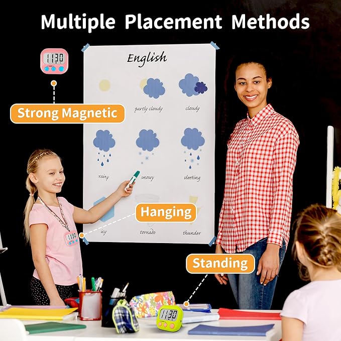 - Classroom timer with Strong Magnetic back 2.0 retractable stand and hook for hanging, can be positioned in variety of locations, like table, blackboard, dry erase board and wall hooks.