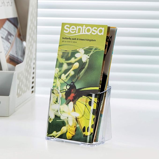 - Versatile Brochure Holder: Our plastic brochure holder fits for 4 inches wide trifold brochures, flyers, booklets etc. The literature holder has a pre-drilled hole at back , so you can not only use it as a desk brochure holder but also use as a wall mount brochure holder.
