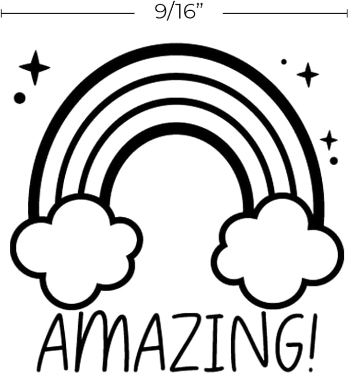 - Design: Black ink stamp incorporates the word "Amazing!" below an adorable rainbow illustration.