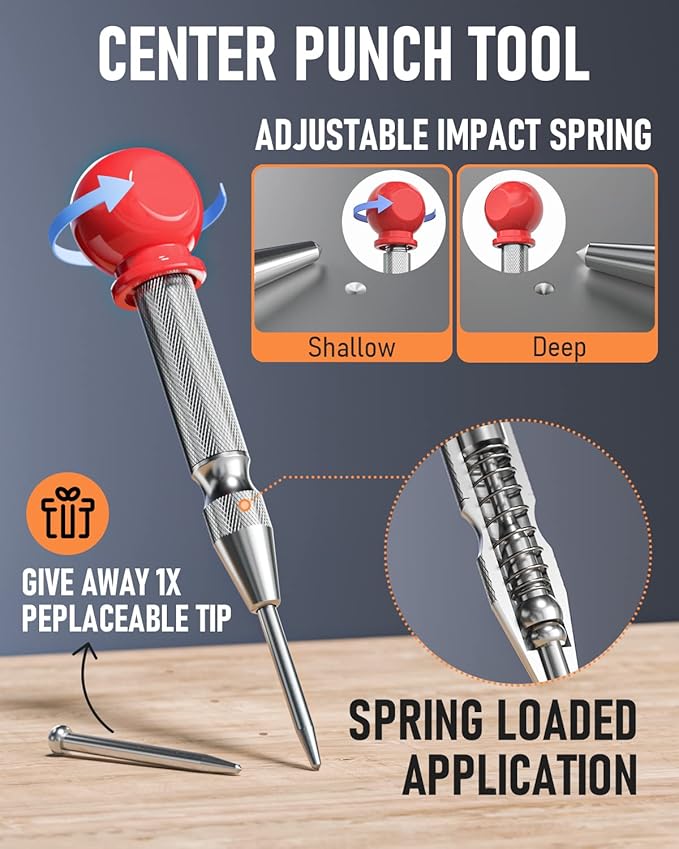 - Various Carpenter Tools For Wide Use: With a Metal Carbide Scribe Tool, which is easy to carve on hard material such as metal, tile, glass, ceramics, wood and more. A Spring Loaded Center Punch can be operated with one hand and accurately mark a centering spot for drilling holes