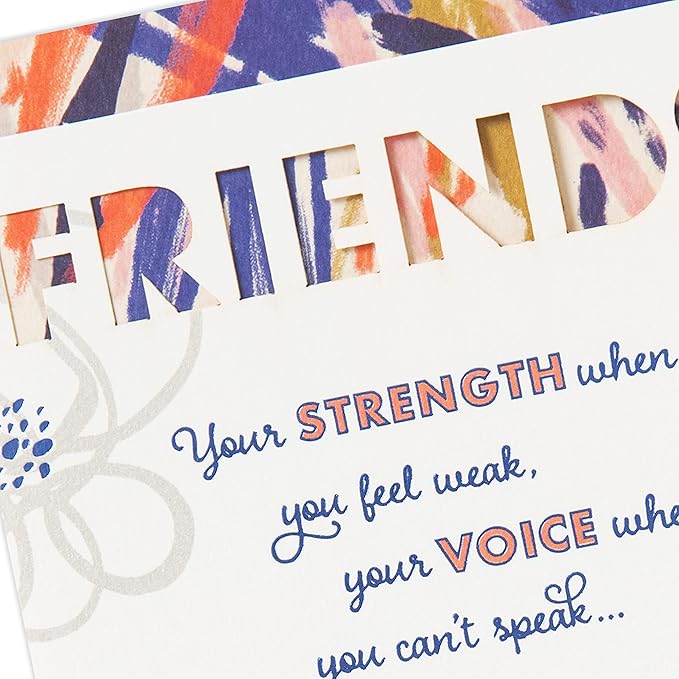 - Cover features a die-cut lettering design on an abstract painted background, and doodled flowers, accented with metallic foil. Message reads: "Friends. Your strength when you feel weak, your voice when you can't speak . . ."