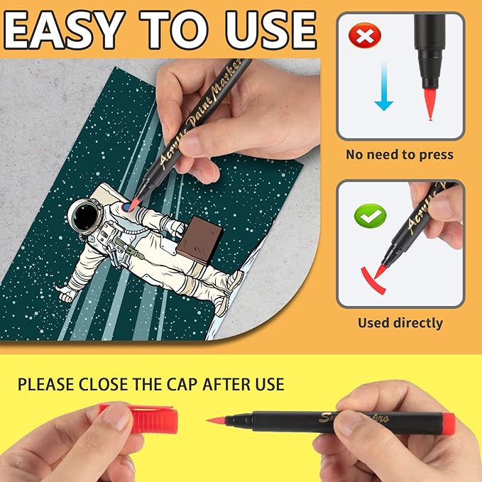 - Acrylic paint markers - PP material pen barrel, strong and durable, comfortable grip, suitable for long-time use. 1-6mm brush tip, you can freely use your creativity. Marker color cap, easy for you to store and find the color.