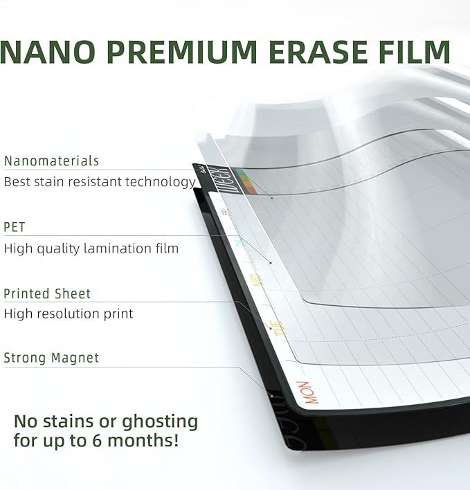 - Erases easily - We use nano premium erase film on our products. Compared to the old PET film, the nano material will make your writings super easy to be wiped off even after you leave the writings on the calendar for a long time.