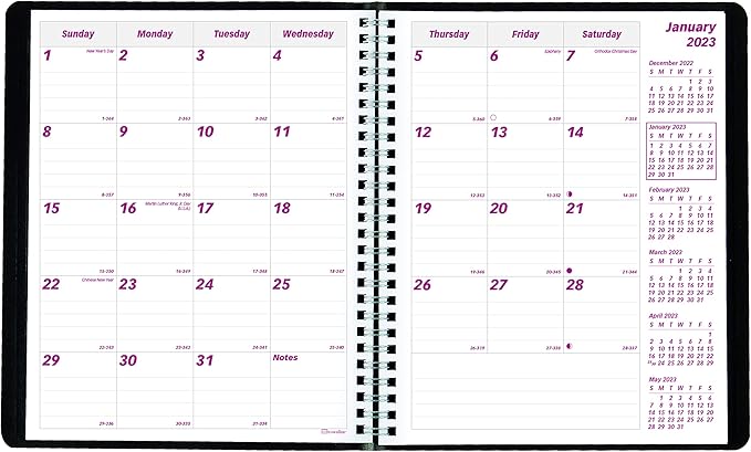 - One month on each spread with ruled daily blocks for notes.
