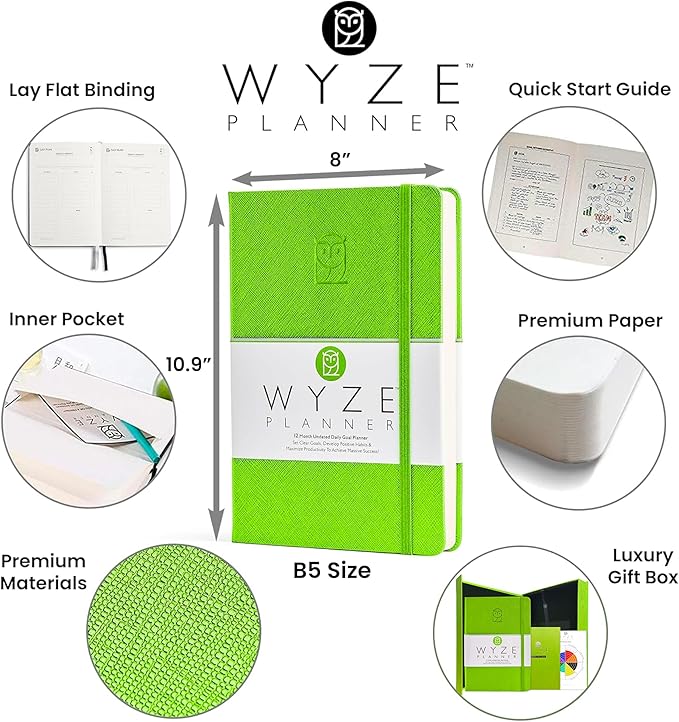 Pro - Goal Setting Planner to Increase Productivity and Achieve Personal and Business Goals. 12 Month Undated Daily, Weekly and Monthly Journal Organizer with Calendar (Lime Green)