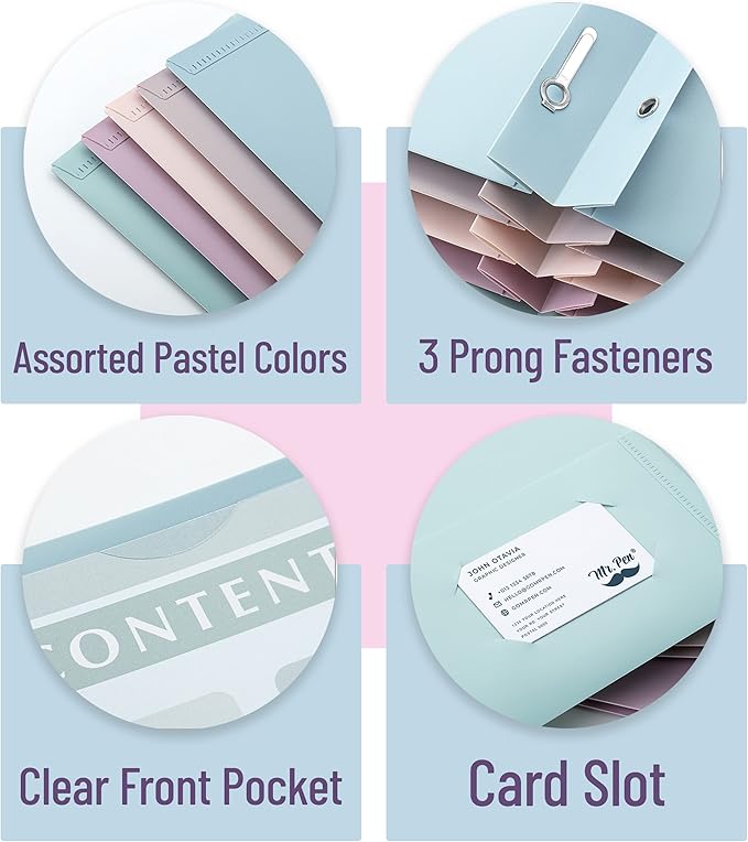 Mr. Pen- Plastic Folders with Clear Front Pocket, 5 pcs, Pastel Colors, File Folders with Fasteners for Documents