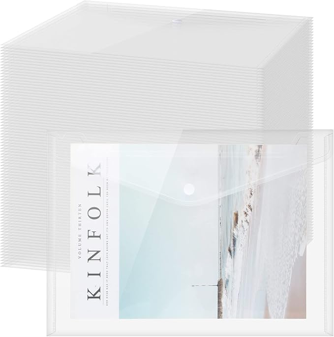 Zhehao 100 Pcs Clear Envelopes with Snap Button Closure A4 Letter Size Plastic Envelope Folder Poly Document File Folders for home Office(Clear,Simple Style)