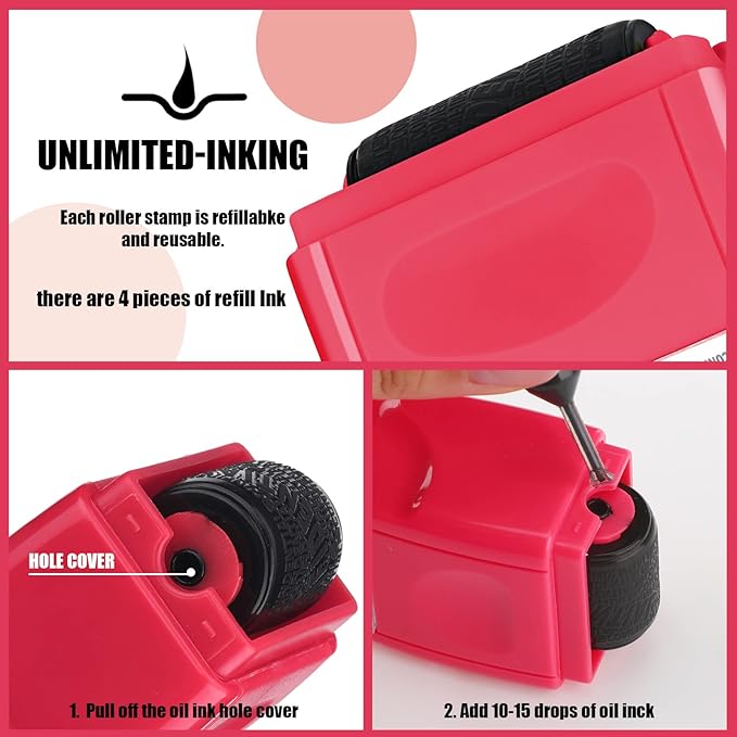 - How to Refill the Ink: there are 4 pieces of ID stamp refills, each is about 1.5 ml, you just need to unscrew the cap of the ink bottle (not disposable, you can close the cap for next time of use), then insert it into the hole on the side of the stamp, then turn it upside down, about 5 minutes later, the most of the ink will be replenished to the security roller stamp