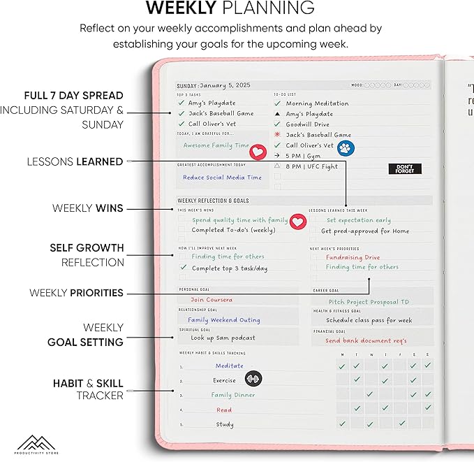 - Undated Weekly Planner with Planner Stickers & Other Bonuses: Use the weekly planner sections to plan ahead each week and reflecting on your weekly performance. This 2025 weekly planner also comes with 5 Bonus features including planner stickers, a habit tracker, weekly inspirational quotes and space for notes.