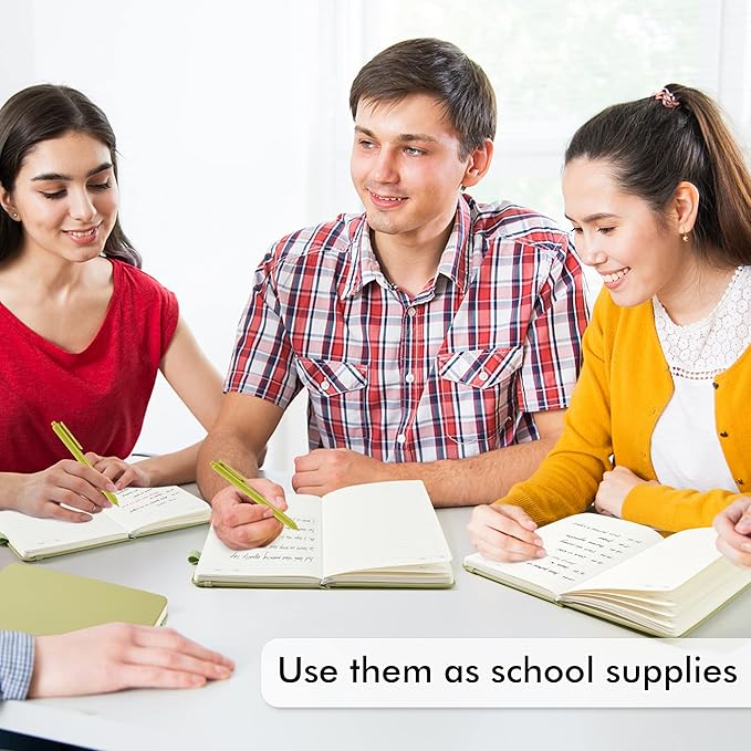 - Feela 5 Pack Classic Ruled Notebooks contains 5 Avocado Green ruled sturdy cover notebooks and 5 Black Retractable Pens. Each of the notebooks measures 8.3” x 5.1”, which is perfect to carry and easily held in hand. These black cute pens are customized to be placed in the pen holder, which is pretty convenient.