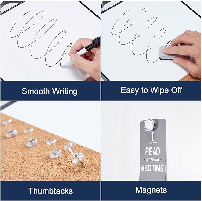 • PREMIUM QUALITY: This 16" X 12" small whiteboard set includes a dry erase board and corkboard. The magnetic whiteboard comes with a smooth surface, easy to clean up and write on. The bulletin cork board is equipped with premium durable cork, fits all variety of nails and pins without damage to the cork.