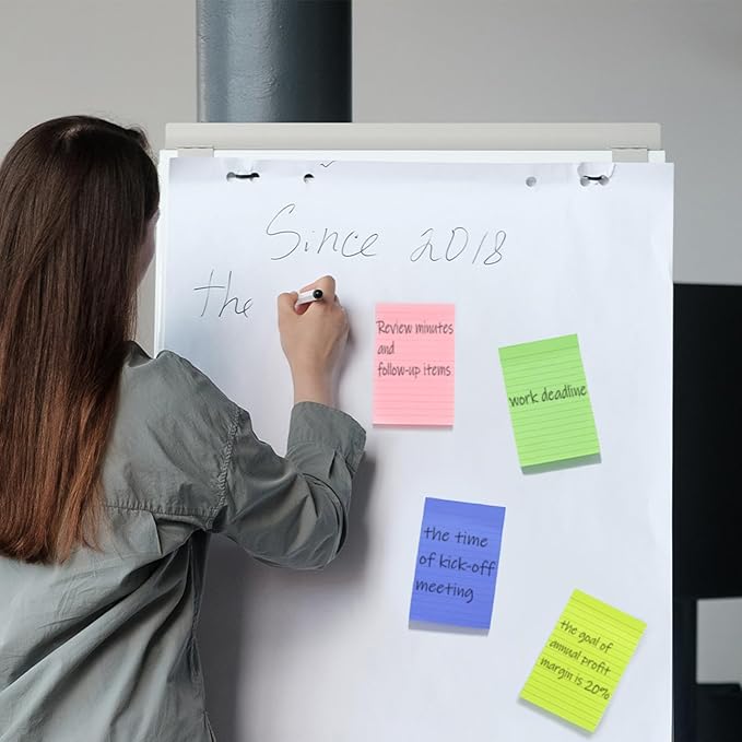 - Package: Comes with 24 packs 4" x 6" lined sticky notes,8 bright assorted color, each color for 3 packs, 50 sheets/pad. 1200 sheets in total. Enough quantity for daily use.