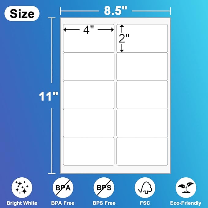 - Label size: 2" X 4", Sheet Size: 8.5" x 11". 10 labels per page. 100 sheets, 1000 blank white sticker labels.