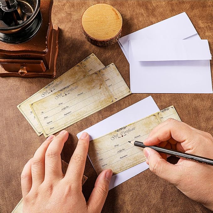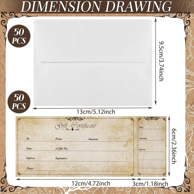 Sinmoe 50 Sets Gift Certificate for Business with 50 Pcs Envelopes Blank Gift Certificate Cards with Name and Address Rustic for Beauty Salon Restaurants Birthday(4.72 x 2.36 Inch, Retro Style)