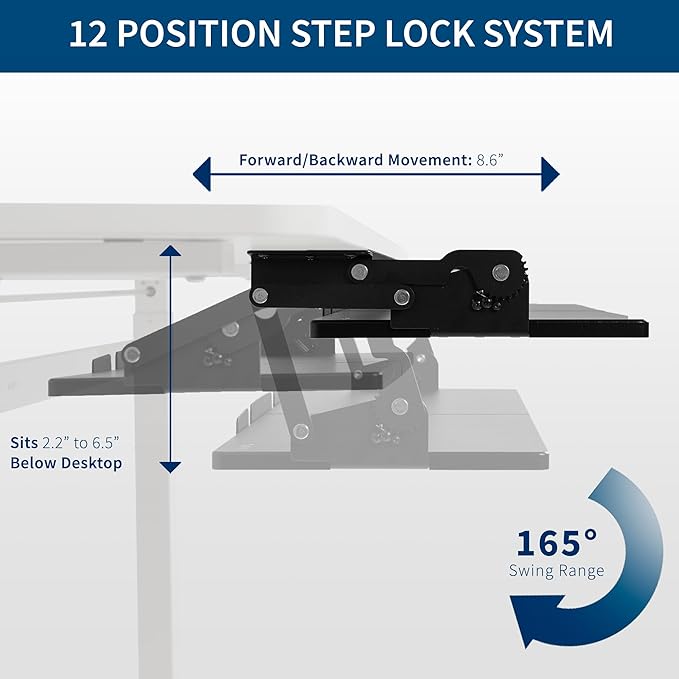 - Height Adjustment - Adjust the distance between your tray and the desktop (2.2" to 6.5") with the simple 12-step locking system. This encourages ergonomic posture and accommodates thicker table tops.