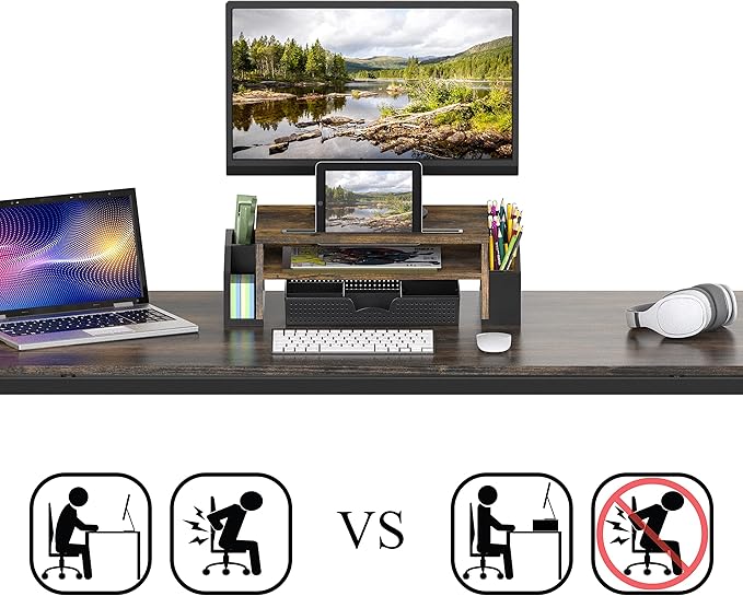 - Raises your monitor to a comfortable viewing height. Reduce neck and eye Strain.