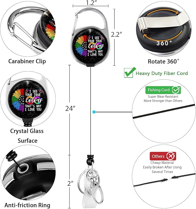 - Versatile Usage: The retractable badge reel is made of premium plastic and steel, sturdy and light-weight. It is easy to clip on to a belt, backpack, pocket or anywhere you like, with 360 rotating carabiner clip. You can attach your keys, student cards, or ID cards to the key holder easily and conveniently. Great for nurses, doctors, maintenance, office staff, business people, teachers, students, factory workers, drivers, etc