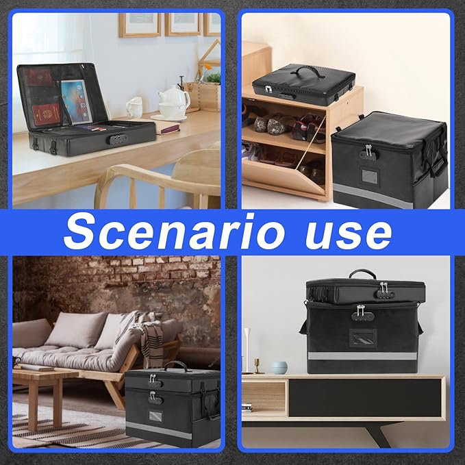 - PORTABLE FIREPROOF STORAGE BOX: Document organizer with lighter and sturdy handles, our fireproof box can be moved and carried more easily. You can use it in many places like home, office, car or outdoor activities. The inside of the filing box is supported by PP material, which is not easy to deform, so you can easily fold or stack multiple boxes together.