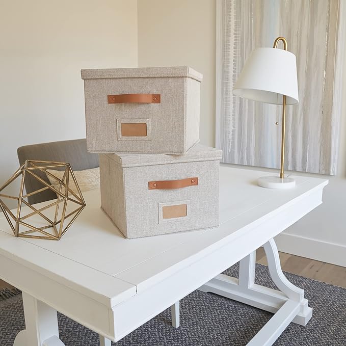ZICOTO Decorative File Organizer Box Set of 2 - Collapsible Linen Filing Cabinets w/Handles Are Perfect to Store all Your Documents & Hanging File Folders - Portable Easy Slide Crates with Lid