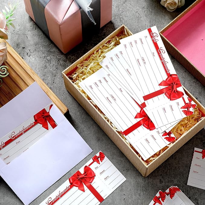 Sinmoe 50 Sets Gift Certificate for Business with 50 Pcs Envelopes Blank Gift Certificate Cards with Name and Address Rustic for Beauty Salon Restaurants Birthday(4.72 x 2.36 Inch, Ribbon Style)
