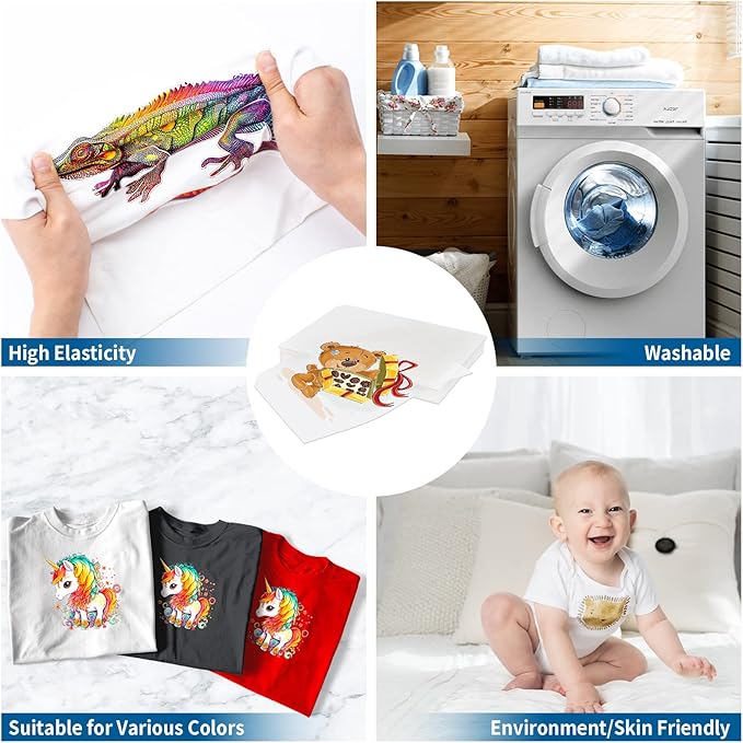 - 【Double-Side Matte & Vivid Colors】JOYCUT DTF transfer film is double-side matte coating, the printing side coating exceeds 10 times, non printing side coating 2 times. Which can prevent slip and allow the paper to run more smoothly in printing. Excellent ink absorption performance makes the printed pattern clear and colorful with high color transfer rate.