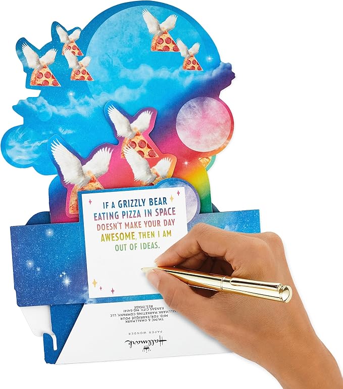 - Back of card reads: "If a grizzly bear eating pizza in space doesn't make your day awesome, then I am out of ideas," and includes space for a brief message.