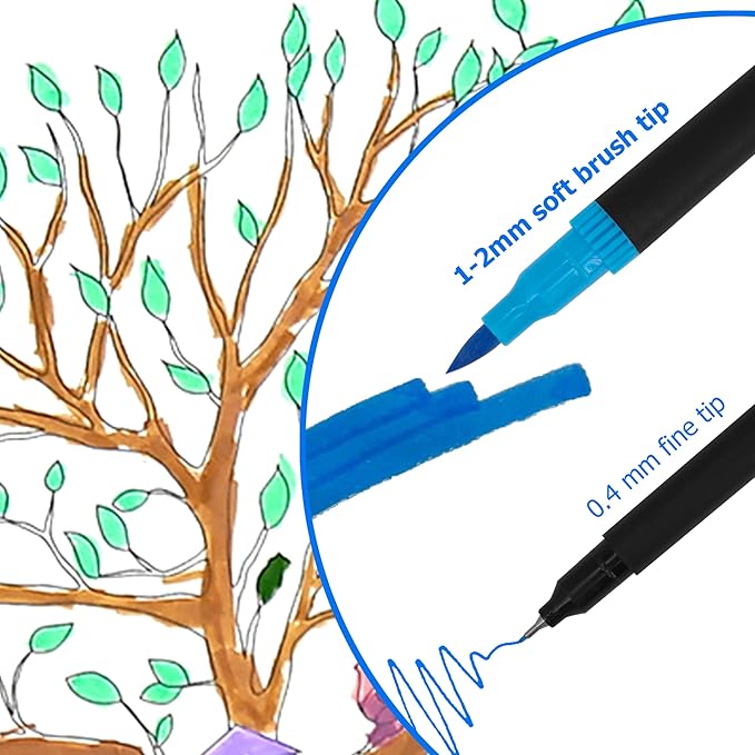 - Dual tip design - The design of the dual tip makes your drawing process more convenient and easy. 1-2mm soft brush tip for shading, and coloring and 0.4 mm fine tip for outlining, detail, extremely practical.