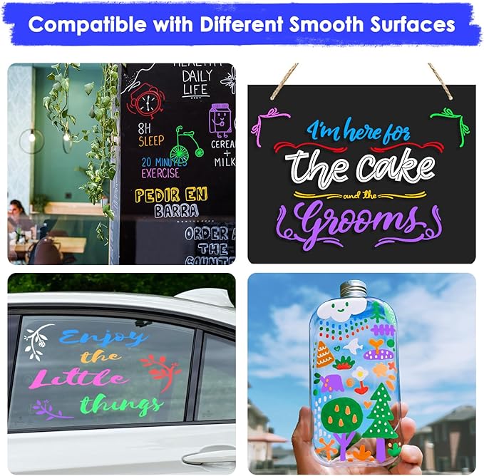 - Unleash your creativity on a variety of surfaces: The Maxtek neon fine tip markers set includes 7 neon colors plus 2 white neon markers, widely used to decorate wedding signs, windows, calendar board, milestone boards, menus, LED boards, car mirrors, wine glasses or any Non-Porous surface
