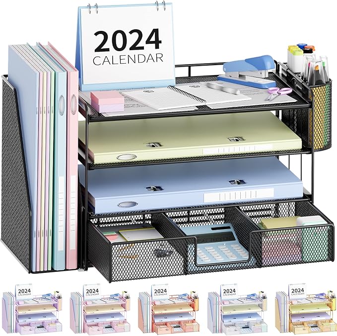 - 🎁【Multi-Functional Office Organization】Get your work area in order with the OPNICE Desk Organizer! Featuring 4 spacious trays, a vertical file organizer, 2 convenient hanging pen holders, and a sliding drawer, you can store all your office supplies, classify and organize them, and keep your desktop tidy