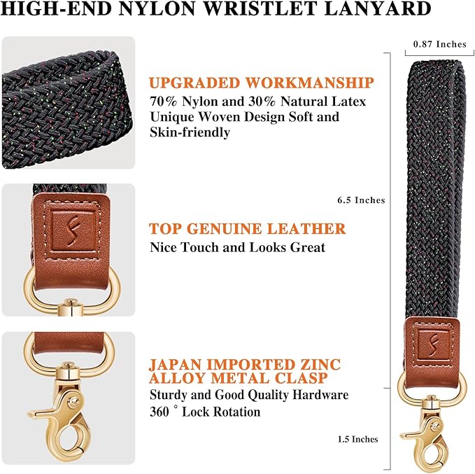- Upgraded Stretchy Design: Fishent wrist lanyard is roughly 0.87 inches width and 6.5 inches length from the bottom of the leather to the top of the wrist key loop, with super-soft weave strap(stretchy), genuine leather and quality metal wristband keyring clasp lanyards for keys. The hand wrist lanyards keychain adopt unique upgraded stretchy nylon design, the wrist strap is soft and textured. Comfortable to wear and not easily deformed.