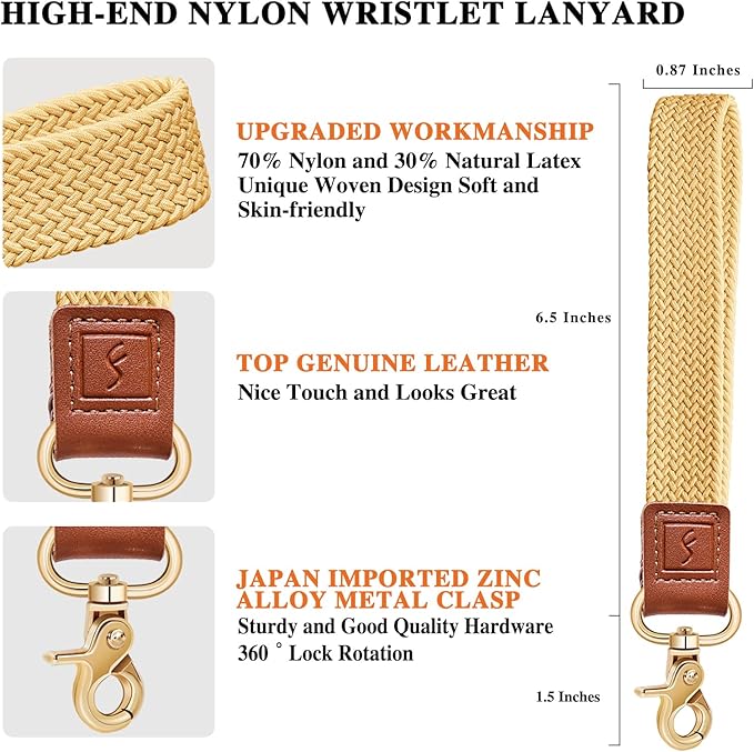 - Upgraded Stretchy Design: Fishent wrist lanyard is roughly 0.87 inches width and 6.5 inches length from the bottom of the leather to the top of the wrist key loop, with super-soft weave strap(stretchy), genuine leather and quality metal wristband keyring clasp lanyards for keys. The hand wrist lanyards keychain adopt unique upgraded stretchy nylon design, the wrist strap is soft and textured. Comfortable to wear and not easily deformed.