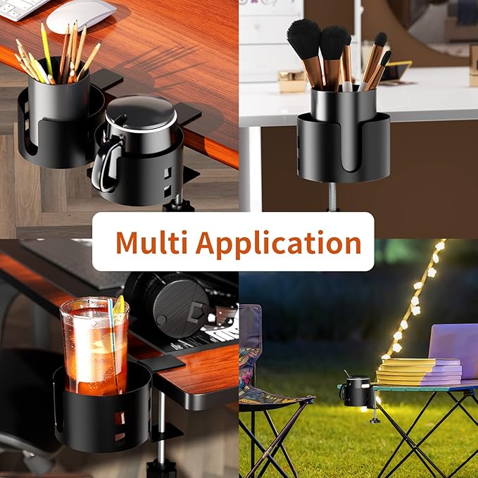- 【No Drill Needed & Protect Your Desk】 The cup holder with five installation buckles and a clamp mount helps easily install and remove. Simply tighten the black knob downward by hand instead of drilling a hole or paste with glue to the underside of your desk, so leave no damage to your desk. The protective pads between the clips are excellent for preventing scratches on your table and stabilizing the cup holder.