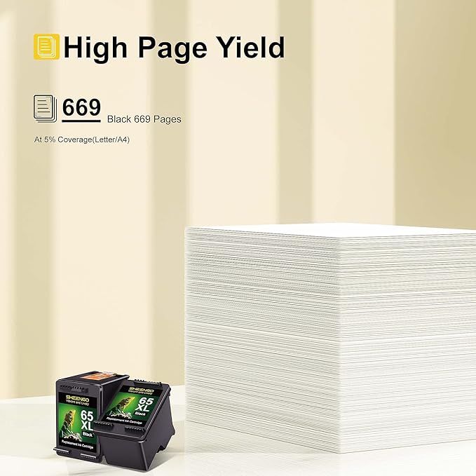 - Cartridge yield (approx.): 669 pages per HP65 XL Black Cartridge