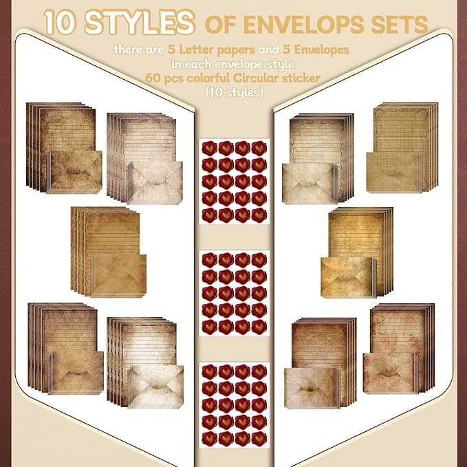 TaoBary 160 Packs Stationery Paper Set (50 Double Sided Stationery Writing Papers 50 Matching Envelopes) 60 Round Dot Sticker, 10 Design(Vintage,8.5 x 11 Inch)