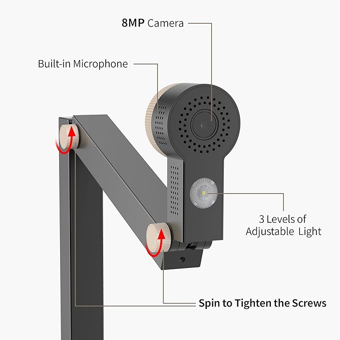 - 8MP HD Camera: Streams at up to 60 fps at Full HD 1080P, and up to 15 fps at 4K Ultra HD(3264x2448 pixels), Capture Max A3 Size: 16.5" x 11.7". Tips: spin to tighten the screws for stabilizing the forearm