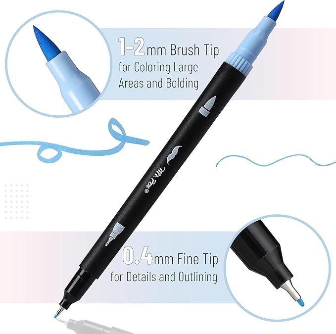 - Mr. Pen dual tip brush pens set includes 12 vibrant pens each featuring a 1-2 mm brush tip for bold, sweeping strokes and a 0.4 mm fine tip for detailed, precise lines.