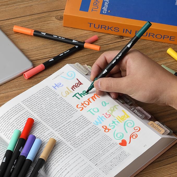 - Enjoy a wide spectrum of color with these dual-tip brush pens, perfect for artistic creations, calligraphy, coloring, and more, with each color designed to stand out vividly on any page.