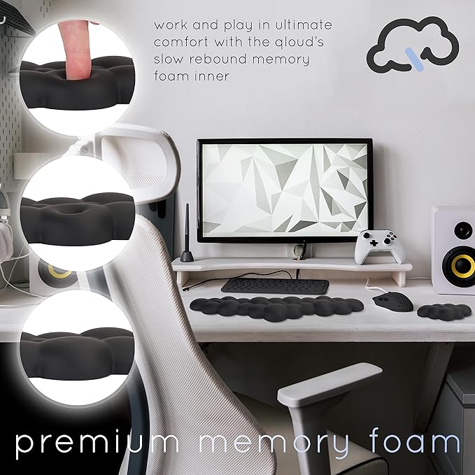 - CLOUD SOFT COMFORT - A premium high density memory foam cloud wrist pad arm rest for keyboard with a new soft-touch breathable material that is ultra comfortable against your skin. This cute and squishy cloud keyboard pad with wrist support is durable and contoured perfectly for you. A keyboard hand rest that is the perfect gaming keyboard wrist rest with wrist support for keyboard rest wrist pad. A super comfy desk wrist rest cloud desk pad