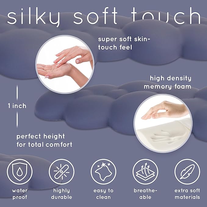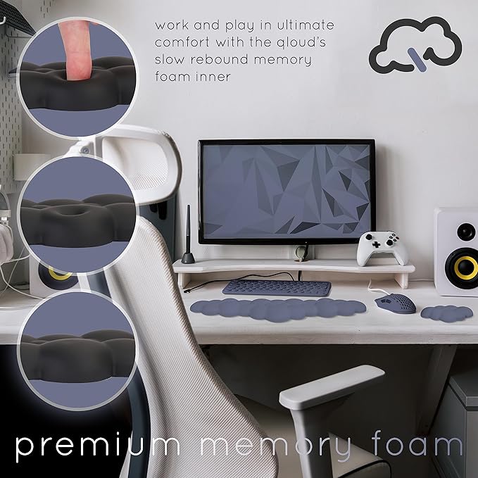 - CLOUD SOFT COMFORT - A premium high density memory foam cloud wrist pad arm rest for keyboard with a new soft-touch breathable material that is ultra comfortable against your skin. This cute and squishy cloud keyboard pad with wrist support is durable and contoured perfectly for you. A keyboard hand rest that is the perfect gaming keyboard wrist rest with wrist support for keyboard rest wrist pad. A super comfy desk wrist rest cloud desk pad