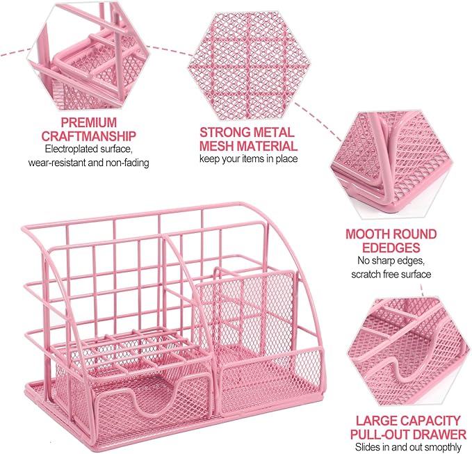 JUOPIEA Desk Organizers and Accessories Office Supplies Organizer with Pen Holder, 72 Clips Set and Phone Stand, Metal Mesh Desktop Organizers with Drawer for Home, Office, School Ect