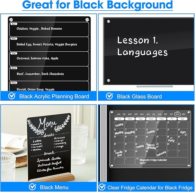 - Easy to Read on Black or Dark Background. 14 white erasable wet liquid chalk markers are visible on black glass board, black acrylic calendar planning board, black menu board for kitchen, black meal planner, black coffee sign, black chore chart board.