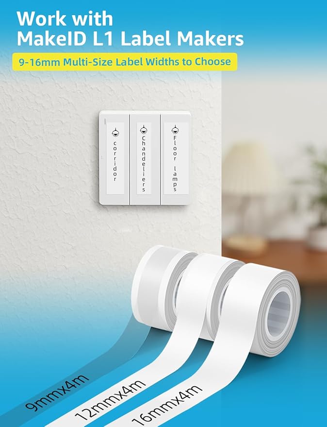 MakeID Label Maker Tape - 9mm Self-Adhesive Sticker Label Tape Refill Compatible with MakeID L1 Label Machine - Waterproof 6-Layer Laminated Film, Split-Back Design - 0.35"x13' (9mm x 4m)